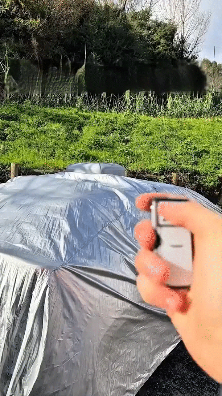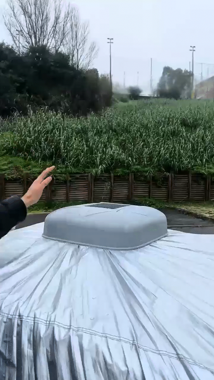 Rovera ist aerodynamisch ausgelegt und bleibt bis 30 mph stabil. Bei sehr starken Böen lösen sich die Stoffverbindungen automatisch, damit die Abdeckung nicht wie ein Segel wirkt.